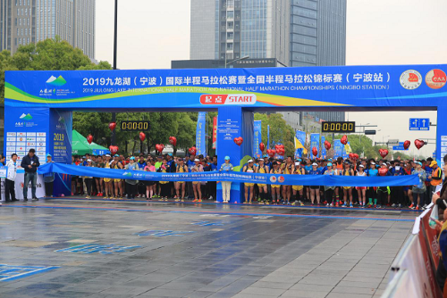 4月14日, 2019九龍湖(寧波)國際半程馬拉松賽暨全國半程馬拉松錦標賽(寧波站)在寧波市鎮海區市民廣場起跑。來自全球28個國家和地區的10000余名跑步愛好者一起沖出起跑線,躍動在中國田徑協會認證的最美“自然生態”賽道上。