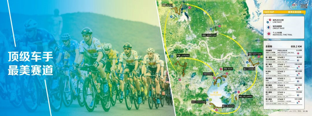 2018年第九屆環(huán)太湖賽仍延續(xù)7站8日賽制,總賽程為808.2KM,來自世界各地的126名頂級運動員,用車輪在無錫濱湖、鎮(zhèn)江句容、淮安金湖、泰州姜堰、南通-海門、蘇州吳江、長興-湖州留下了深深的印記。無錫黿頭渚、靈山大佛,句容赤山湖國家濕地公園、茅山國家5A級旅游景區(qū),金湖堯帝古城、水上森林公園,姜堰溱湖旅游度假區(qū),吳江蘇州灣體育公園,湖州南太湖秀美風光……獨具匠心的線路設計,串聯(lián)起眾多美景,人文景觀與自然風光交相輝映。