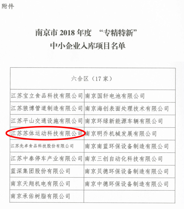蘇體運動科技公司成功通過南京市2018年度“專精特新”中小企業(yè)認定