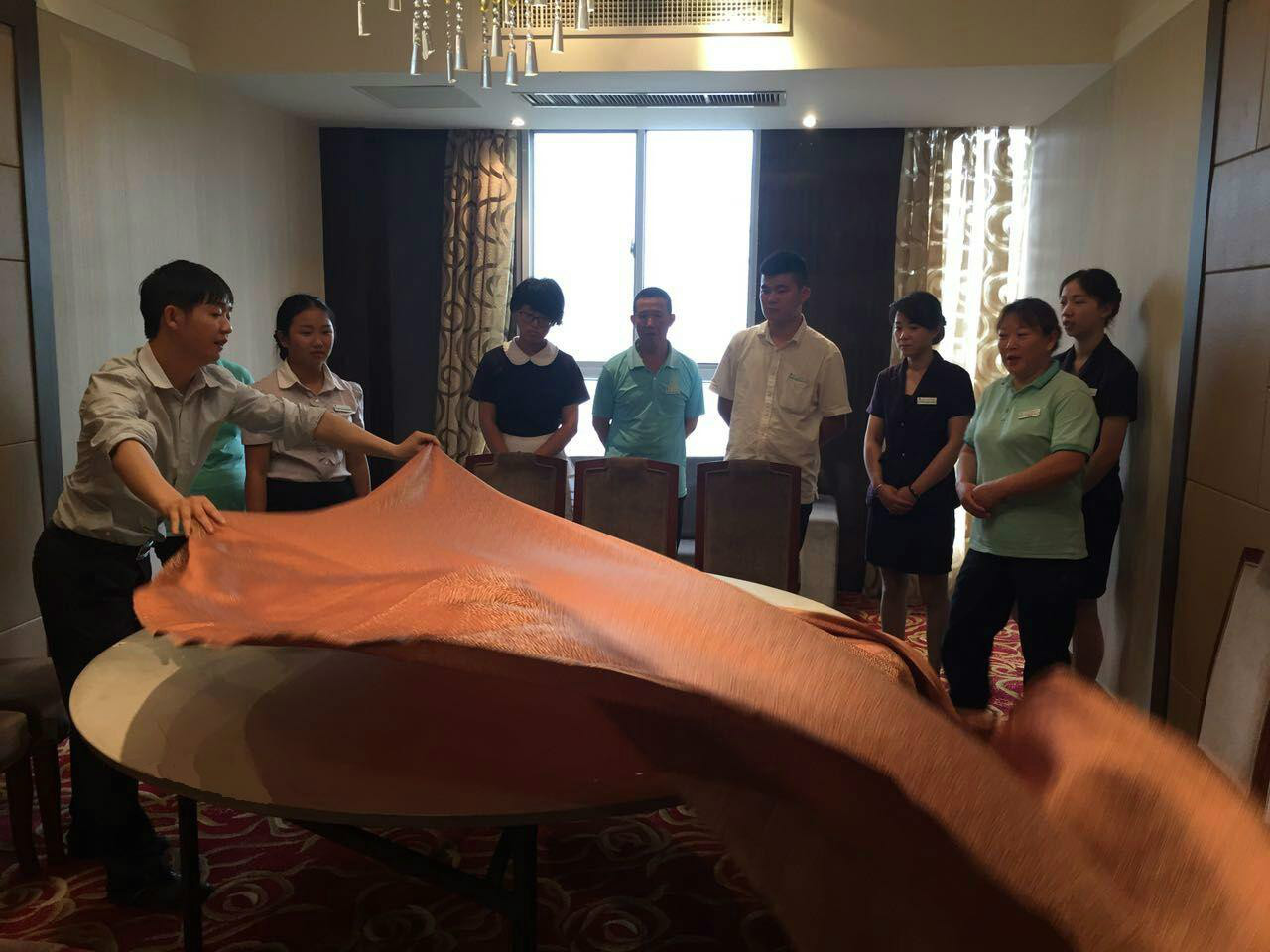 此次培訓分為理論和實操兩個環節,理論部分通過服務禮儀、操作規范、標準化服務、服務常用英語等內容進行相應指導,實操部分包括前廳接待服務、中式鋪床、布草折疊、中餐宴會擺臺及斟酒操作規范。